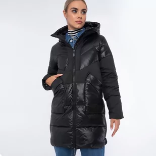 Damski płaszcz z kapturem. Ten stylowy płaszcz doda szyku Twoim strojom w czasie zimy. Połączenie połyskującego nylonu i matowego poliestru tworzy wyjątkowy efekt, który dopełnia geometryczne pikowanie. W otwartych kieszeniach z przodu wygodnie schowasz dłonie lub małe drobiazgi. Kaptur jest nieduży, ale komfortowo ochroni Twoją głowę przed zimnem.