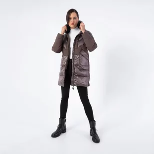 Damski płaszcz z kapturem. Ten stylowy płaszcz doda szyku Twoim strojom w czasie zimy. Połączenie połyskującego nylonu i matowego poliestru tworzy wyjątkowy efekt, który dopełnia geometryczne pikowanie. W otwartych kieszeniach z przodu wygodnie schowasz dłonie lub małe drobiazgi. Kaptur jest nieduży, ale komfortowo ochroni Twoją głowę przed zimnem.