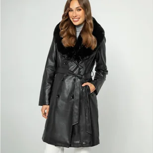 Design: Płaszcz wyposażony jest w szeroki, futrzany kołnierz, który nie tylko dodaje elegancji, ale także zapewnia doskonałą ochronę przed zimnem. Zapięcie: Dwurzędowe zapięcie na guziki to klasyczne rozwiązanie, które dodaje płaszczowi ponadczasowego stylu. Guziki są solidne i estetycznie wykonane, zapewniając nie tylko funkcjonalność, ale także elegancki detal, który podkreśla jakość wykonania. Dwie ukośne kieszenie to praktyczne rozwiązanie, które dodaje funkcjonalności płaszczowi. Pozwalają na wygodne przechowywanie drobiazgów i zapewniają dodatkowy komfort.