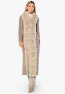 Długi damski płaszcz z wełny i sztucznego futra beżowy