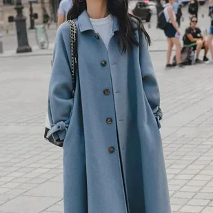 Długi płaszcz damski wiązany w talii - Niebieski M