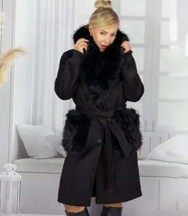 Fason: Klasyczny, Wiązany – Płaszcz o długości do kolana, wiązany w talii szerokim, materiałowym paskiem, co pozwala na idealne dopasowanie i podkreślenie sylwetki. Futrzane Detale: Kołnierz i Kieszenie – Obszerny, szalowy kołnierz oraz dwie duże, naszywane kieszenie wykonane z puszystego futra ekologicznego, stanowiące główny, luksusowy akcent. Materiał: Miękki, Wełnopodobny – Tkanina imitująca wełnę lub kaszmir, która zapewnia ciepło i elegancki, matowy wygląd. Wykończenie: