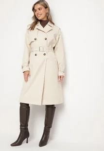 Jasnobeżowy Płaszcz Dwurzędowy Trencz Ozdobiony Paskiem i Pagonami Malwissa