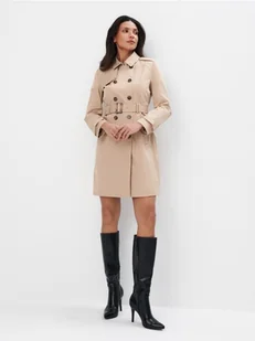 Płaszcz typu trencz w beżowym kolorze. Posiada dwurzędowe zapięcie na guziki oraz pasek w talii.