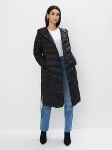 Czarny pikowany płaszcz z kapturem i wiązaniem w talii. Posiada zapięcie na guziki.