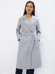 Elegancki dwurzędowy płaszcz w kolorze szarym, z wiązaniem w talii.