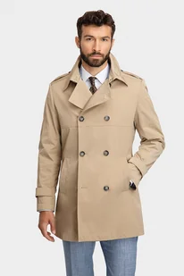Stylowy dwurzędowy trencz w eleganckim odcieniu beżu to doskonały wybór dla mężczyzn ceniących ponadczasowy design i funkcjonalność. Dzięki starannie dobranemu składowi płaszcz łączy trwałość i odporność na warunki atmosferyczne z przewiewnością i komfortem noszenia.