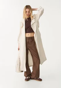 Luźny trencz bez zapięcia z kołnierzem z klapami i długimi wywiniętymi rękawami z patkami na guziki. Boczne kieszenie z wypustką. Ozdobna tkanina z marszczoną fakturą. Zapięcie z przodu na pasek z tego samego materiału z metalową sprzączkę.