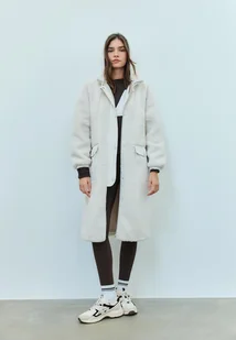 Długi płaszcz ze sztucznego kożuszka. Podwyższony kołnierz z odpinanym i regulowanym kapturem. Długie rękawy zakończone elastyczną gumką. Przednie naszyte kieszenie z klapką i zapięciem na zatrzask. Zapięcie z przodu na częściowo ukryty suwak pod listwą z zatrzaskami.