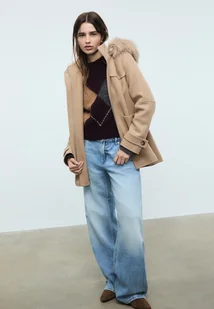 Płaszcz wykonany ze strukturalnej tkaniny z domieszką wełny, z wysokim kołnierzem i Kapturem z odpinanym sztuczne futro. Zapięcie na zamek błyskawiczny ukryty pod klapą i zatrzaskami. Naszyta kieszeń. Detal w postaci szlufek na mankietach.