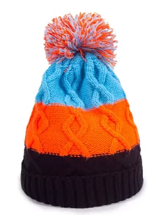 Chłopięca kolorystyka Ciepła,dwuwarstwowa Gustowne ozdoby – wywinięcie i pompon Zimowa czapka dla chłopca w kolorowe pasy: czarny, pomarańczowy i niebieski. O regularnym, warkoczowym splocie. Na górze znajduje się milutki pompon z frędzli. Zakończona ściągaczowym wywinięciem.