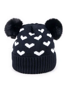 Rozmiar 46-48 cm, dla dziecka w wieku 1-2 lata Stonowana kolorystyka Ciepła, dwuwarstwowa Gustowne ozdoby – dwa pompony Zimowa czapka dla dziewczynki w kolorze czarnym w białe serduszka. O regularnym, delikatnym splocie. Na górze znajdują się dwa milutkie futrzane pompony. Zakończona wywinięciem ze splotu ściągaczowego. Dwuwarstwowa – w środku posiada bawełnianą podszewkę.