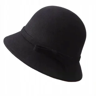 - damski kapelusz typu bucket/cylinder w kolorze czarnym, zdobiony dookoła ronda otokiem o szerokości 1,5cm zwieńczonym subtelną kokardką, - wykonany z filcu wełnianego (typu poliester), - doskonale sprawdzi się jako uzupełnienie eleganckiego stroju, dla szykownej pani, która lubi wyróżniać się z tłumu, - świetnie komponuje się z płaszczami, - lekki, umiarkowanie sztywny, - wykończony od środka potnikiem, - kolor: