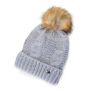 Zimowa czapka damska z pomponem. Efektowny dodatek do stroju na zimę. Czapka ma efektowny warkoczowy splot i gruby, wywinięty ściągacz. Metaliczna nić współgra kolorystycznie z odcieniem czapki, a malutkie opalizujące cekiny wszyte tu i ówdzie mienią się jak płatki śniegu. Całość dopełnia spory pompon z ekofuterka.