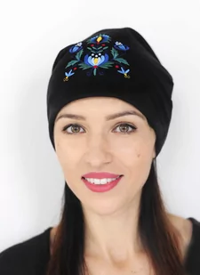 Dwustronna czapka z haftem kaszubskim (czarna) Czapkę można również nosić po wywróceniu na lewą stronę. Posiada kolorowy haft kaszubski z przodu czapki. Praw...