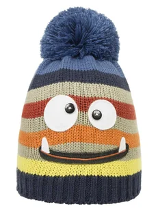 Kolor: niebieski w wielokolorowe paski Wzór: zabawna buźka Ozdoba: pompon na czubku Materiał: 100% akryl Typ: zimowa czapka dziecięca Cechy: