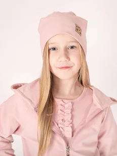 Jednowarstwowa czapka dresowa dla dziewczynki w kolorze pudrowego różu z naszywką z kwiatuszkami. Dzięki dodatkowi elastanu idealnie dopasowuję się do kształ...