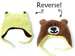 czapka zimowa materiał z długim włosiem troczki zapinane na rzep przedłużenia na uszy filtr UPF 50+ dwustronna aplikacja żaby i misia