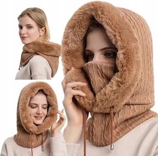 Kominiarka Damska Czapka Komin Z Futerkiem Ciepła Jednoczęściowa Na Zimę Karmel