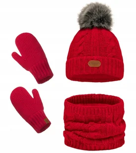 KOMPLET ZIMOWY CZAPKA + KOMIN + RĘKAWICZKI DUŻY POMPON Czerwony A1 PREZENT