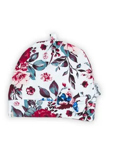 Wyprodukowano w Polsce Bawełniany turban dla dziewczynki, wykonany z białej bawełny z dodatkiem kwiecistych wzorków. Falbanka z przodu nadaje czapeczce dziew...
