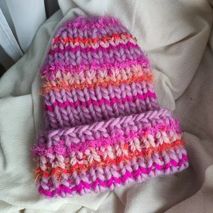 Wełniana kolorowa czapka na drutach WOOLLY orange and pink