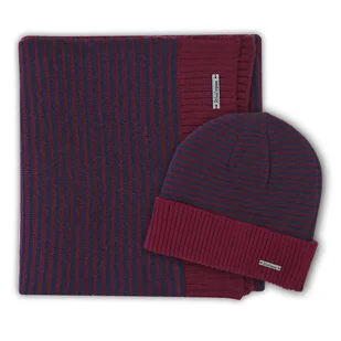 Zestaw szal + czapka w granatowo-bordowe paski W8 Granatowo-szary szalik męski w paski: Szerokość: 23 cm; Długość: 180 cm. Czapka zimowa w bordowo-granatowe paski: Rozmiar uniwersaly: 55-59 cm; Polski producent - WoolTown; Skład tkaniny: