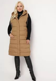 Beżowa Długa Kamizelka Pikowana z Kapturem Rayawa