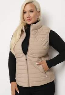 Beżowa Pikowana Kamizelka o Klasycznym Kroju ze Stójką i Zasuwanymi Kieszeniami Celoriah