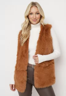 Brązowa Kamizelka z Futerka Ozdobiona Wstawkami z Ekoskóry Robenissa