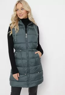 Ciemnozielona Długa Kamizelka Dwustronna Zapinana na Suwak z Pikowaniem i Troczkiem w Pasie Heddemia