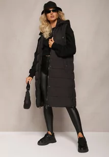 Czarna Pikowana Kamizelka Bezrękawnik o Przedłużonym Fasonie z Kapturem Tawari