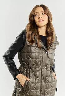 Długa, pikowana kamizelka damska z kapturem. Kamizelka z kieszeniami, zapinanymi rozcięciami z boku oraz ściągaczem na linii talii, który z pewnością podkreśli sylwetkę. Model ten z pewnością sprawdzi się jako baza do codziennych stylizacji. Modelka na zdjęciu ma 177 cm wzrostu i prezentuje rozmiar 36.