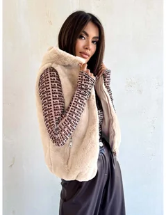 Krótka kamizelka kożuszek CLARE - beżowa Ogrzej się w chłodniejsze dni z naszą stylową, jesienną kamizelką w kolorze beżowym, wykończoną miękkim kożuszkiem. Ten modny bezrękawnik to idealny wybór dla kobiet ceniących sobie komfort i elegancję. Krótka kamizelka zapinana na zamek świetnie komponuje się z casualowymi stylizacjami, dodając im przytulności i szyku. Połącz ją z obcisłym topem i skórzanymi spodniami, aby stworzyć nowoczesny, miejski look. Doskonale sprawdzi się również w zestawieniu z jeansami i botkami, tworząc wygodną i modną stylizację na co dzień.