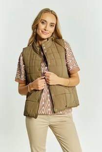 Ta krótka pikowana kamizelka to idealny wybór dla kobiet, które chcą wyglądać stylowo i modnie w chłodniejsze dni. Wykonana z gładkiej tkaniny, jest nie tylko bardzo miękka i przyjemna w dotyku, ale także ocieplona, co zapewni ciepło i komfort. Wyższy kołnierz oraz zapięcie na napy dodają elegancji temu prostemu krojowi. Kamizelka posiada dwie kieszenie na przodzie oraz ozdobne napy bo bokach, które dodają jej uroku i charakteru. To doskonały wybór dla kobiet ceniących sobie funkcjonalność i styl w jednym! Modelka prezentuje rozmiar S i mierzy 177 centymetrów wzrostu
