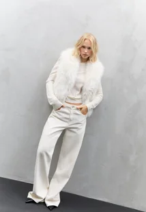 Kamizelka wykonana z tkaniny imitującej futro. Kołnierz z klapami i bez rękawów. Kieszenie boczne. Zapięcie z przodu na wewnętrzny haftkę.