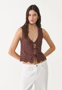 Kamizelka z dekoltem w serek. Tkanina z szydełkowym efektem z przodu. Wiązane sznurki z przodu. Dostępna w różnych kolorach.