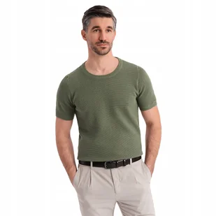 Dzianinowa koszulka męska delikatna struktura oliwkowa OM-TSCT-0244 V5 S Koszulka polskiej marki Ombre o subtelnie sweterkowej fakturze to doskonała propozyc...