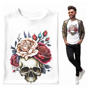 Koszulka Męska Kwiaty i czaszka róże kontrast tatuaż gotycki mrok