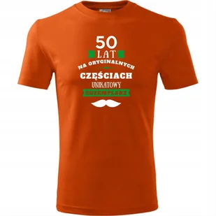 Męska Koszulka Nadruk 50lat na oryginalnych częściach, unikatowy egzemplarz pomarańczowy XL O koszulce męskiej 100 % ekologicznej bawełny wzmocnienie na rami...