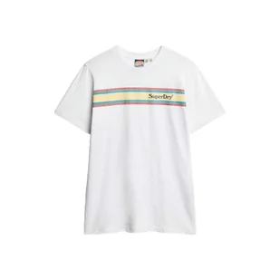 Superdry Venue Logo Stripe Relaxed to niezbędny T-shirt w każdej męskiej garderobie. Dzięki luźnemu krojowi zapewnia maksymalny komfort i styl. Wykonany w 100% z bawełny, jest miękki w dotyku i przyjemny w noszeniu. Okrągły dekolt i krótkie rękawy czynią go idealnym wyborem na ciepłe dni lub pod marynarkę. Paski i charakterystyczne logo na piersi dodają koloru i stylu.
