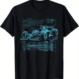TEMU Męska Czarna Koszulka z Niebieskim Narysowaniem Formuły Wyścigowej - Techniczna Biała Liniowa / Projekt Samochodu Wyścigowego, 100% Bawełna,
