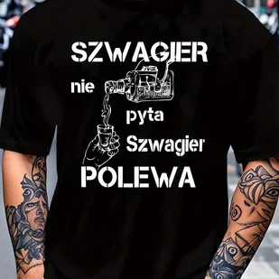 TEMU Męska koszulka z grafiką kubka kawy i cyrylicznym napisem w stylu polskim - z motywem polskiej kultury, krótki rękaw, okrągły dekolt, idealna na