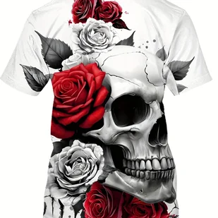 TEMU Męska koszulka z nadrukiem 3D czaszki i róży - swobodny, z okrągłym dekoltem, krótkim rękawem, poliestrowy, letni styl, regularny kroju, doroska