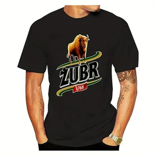 TEMU Męska koszulka Zubr 1768 z logo - Czarna z wyrazistym żółto-zielonym nadrukiem i napisami, casualowa koszulka z krótkim rękawem i okrągłym