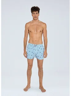 Szorty kąpielowe w kolorze błękitnym - właściwości: odporność na chlor, szybkoschnący materiał - pas: ściągacz tunelowy - majtki wewnętrzne z siateczki: tak - kieszenie: wpuszczane i tylne - wzór: na całości - nadruk: logo
