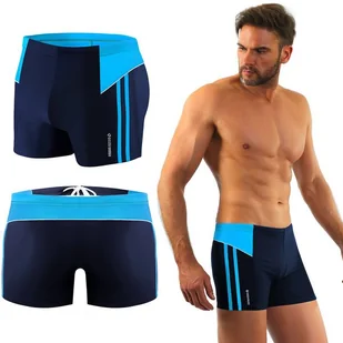 Przylegające do ciała kąpielówki męskie w głębokim granatowym kolorze z niebieskimi dodatkami to idealna propozycja na atrakcyjny strój zarówno na basen, jak i na plażę.