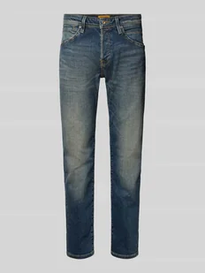 Jeansy męskie Jack & Jones;Mieszanka bawełny i elastanu;Krój tapered fit;Model ‘MIKE’;Efekt znoszenia;Szerokość w pasie w rozmiarze 32/32: 42 cm;Długość wewnętrzna nogawki w rozmiarze 32/32: 75 cm
