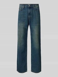 Jeansy męskie REVIEW;Mieszanka bawełny z dodatkiem wiskozy;Krój straight fit;5 kieszeni;Zapięcie na guzik i zamek błyskawiczny;Detal z logo;Szerokość w pasie w rozmiarze 32: 42 cm;Długość wewnętrzna nogawki w rozmiarze 32: 78 cm