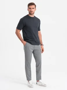 Spodnie o kroju slim Ozdobna taśma w pasie Dwie kieszenie z przodu Tylne kieszenie zapinane na guziki Materiał w kratę Skład: 67% poliester, 30% wiskoza, 3% spandex Kolor: szary Wzrost modela 184 cm. Model prezentuje produkt w rozmiarze: M